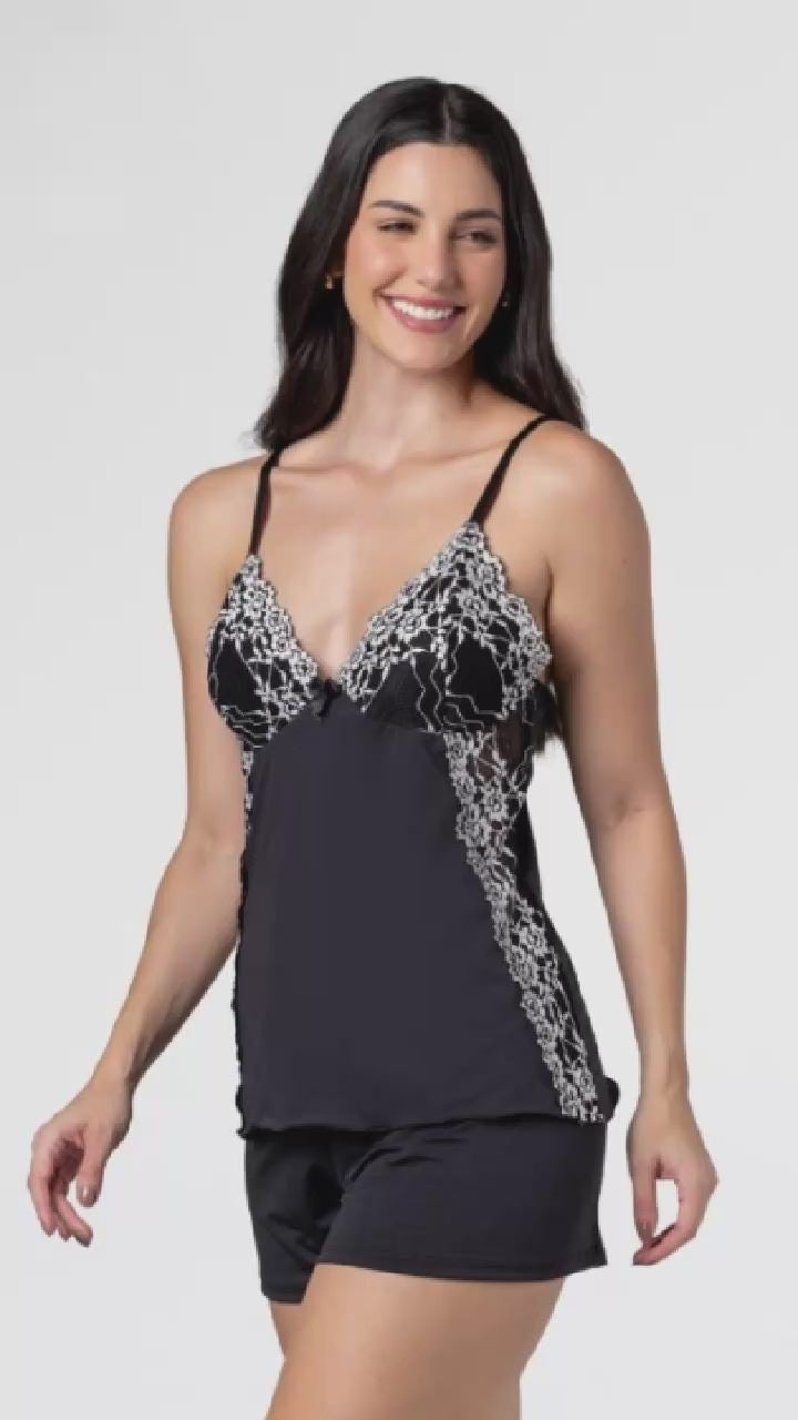 A blusa possui modelagem confortável, enquanto o short tem ajuste suave na cintura, garantindo liberdade total de movimentos e bem-estar durante a noite ou no dia a dia.